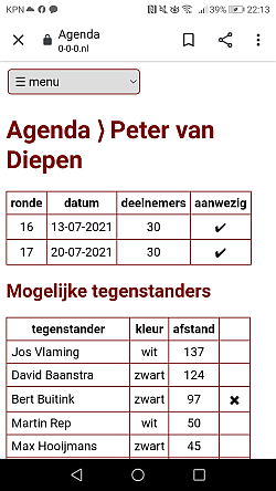 Als alles in seizoen 2021-2022 weer normaal is, staan in zo’n persoonlijke agenda: 33 ronden van de interne competitie en alle wedstrijden van het NHSB-team en het KNSB-team waarvoor je speelt op volgorde van datum. Kortom dan heb je als lid een volledig overzicht van al je partijen voor de Waagtoren. En 0-0-0.nl heeft dus een compleet overzicht van alle leden. Het is de bedoeling dat 0-0-0.nl bij elke aanmelding / afzegging onmiddellijk automatisch een nieuwe voorlopige indeling maakt. Ik hoef als intern wedstrijdleider dus geen aanmeldingen en afzeggingen meer te verwerken. Ik hoef alleen maar de indeling definitief te maken op dinsdagavond om 19:00.